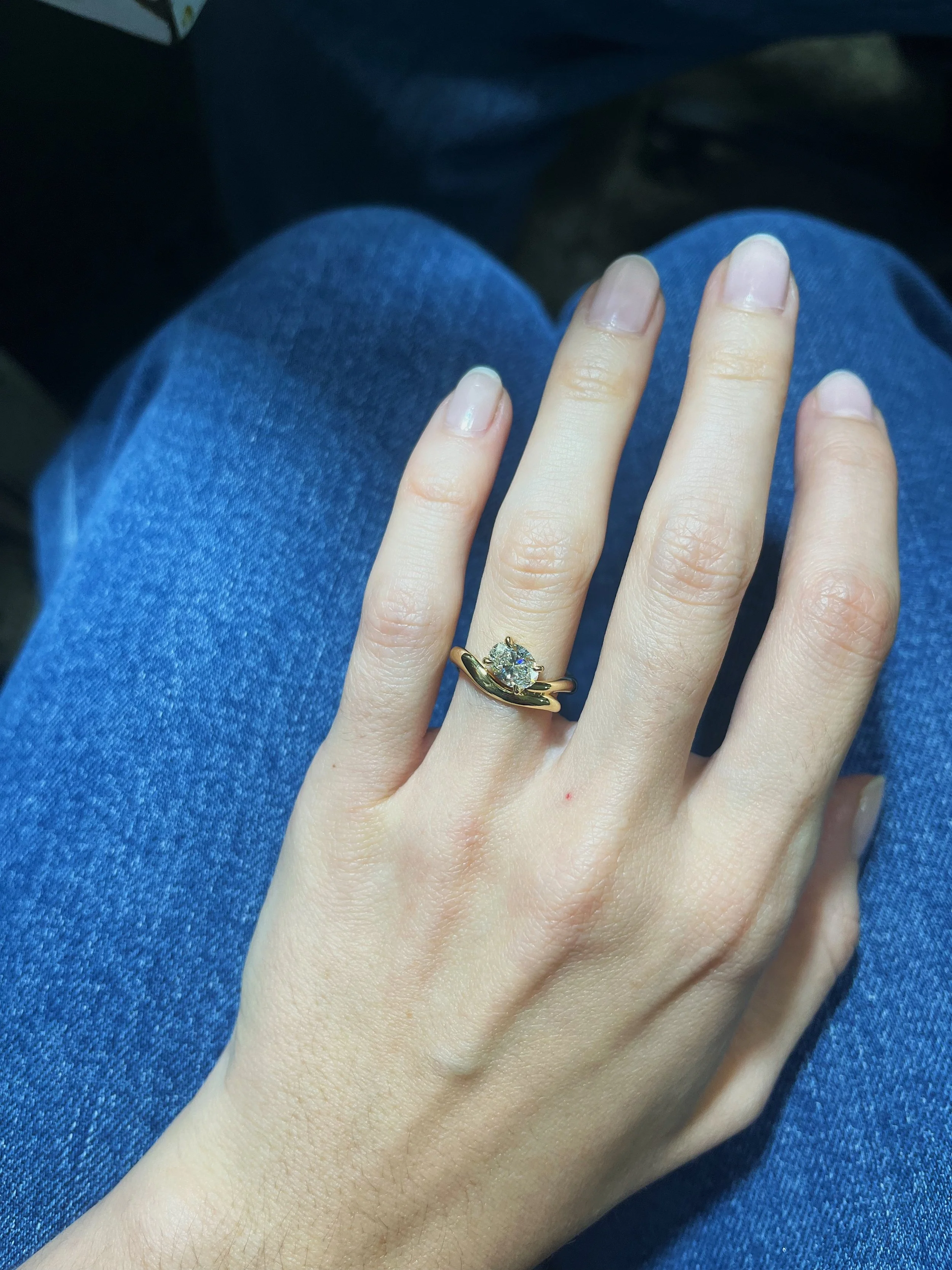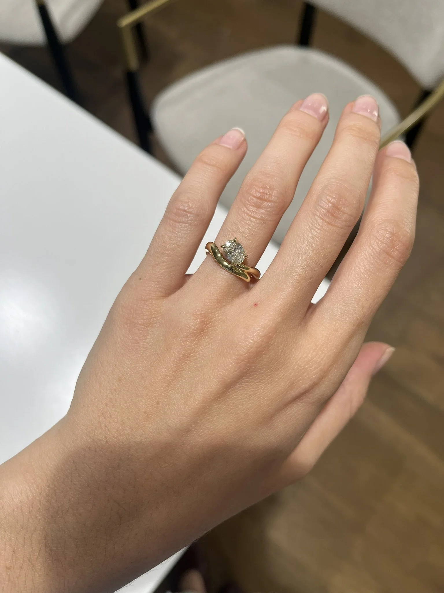 Custom engagement ring in 18k yellow gold, set with a 0.82ct oval natural diamond (GIA certified). Designed with soft, organic lines for everyday comfort, this is a timeless, one-of-a-kind piece.